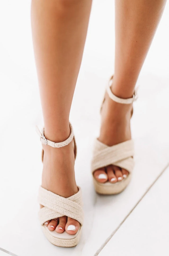 The tan wedges of the summer that will take you right into fall! These strap around the ankles and crisscross across the top and toes.