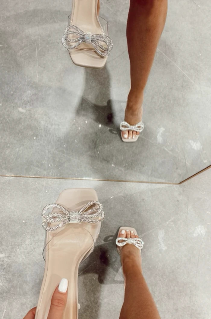 Crystal double bow detailing slide on high heels. These designer dupe heels will be the perfect addition to boutique style dress. You can also pair these heels with jeans and a cute crop top!