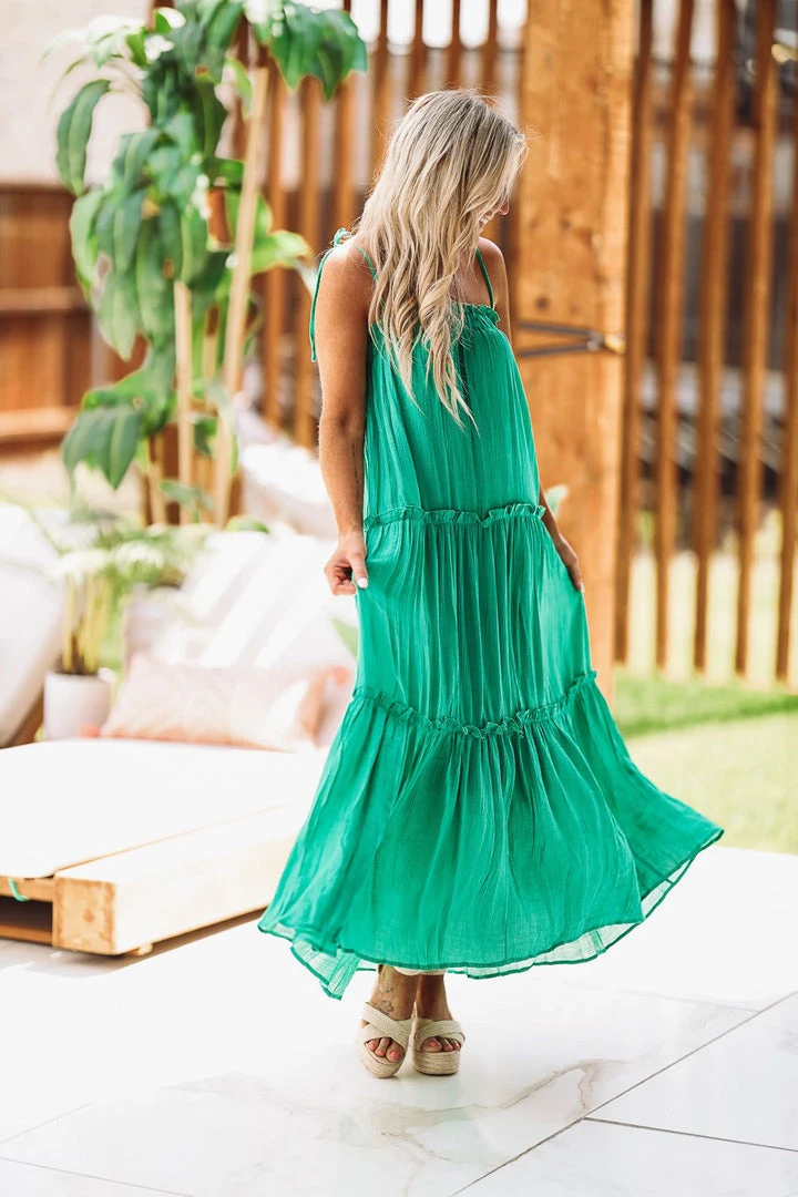 Looking for a green maxi sundress? Look no further! This ruffled, tie shoulder maxi is emerald perfection. It’s lined and flowy. This dress comes in pink and green and we just really feel like you’ll want both. The tie straps make the length adjustable and the elastic at the bust allows for a comfortable fit. Perfect vacation dress. Perfect Sunday dress. Perfect for upcoming graduations and perfect for a summer wedding guest dress.