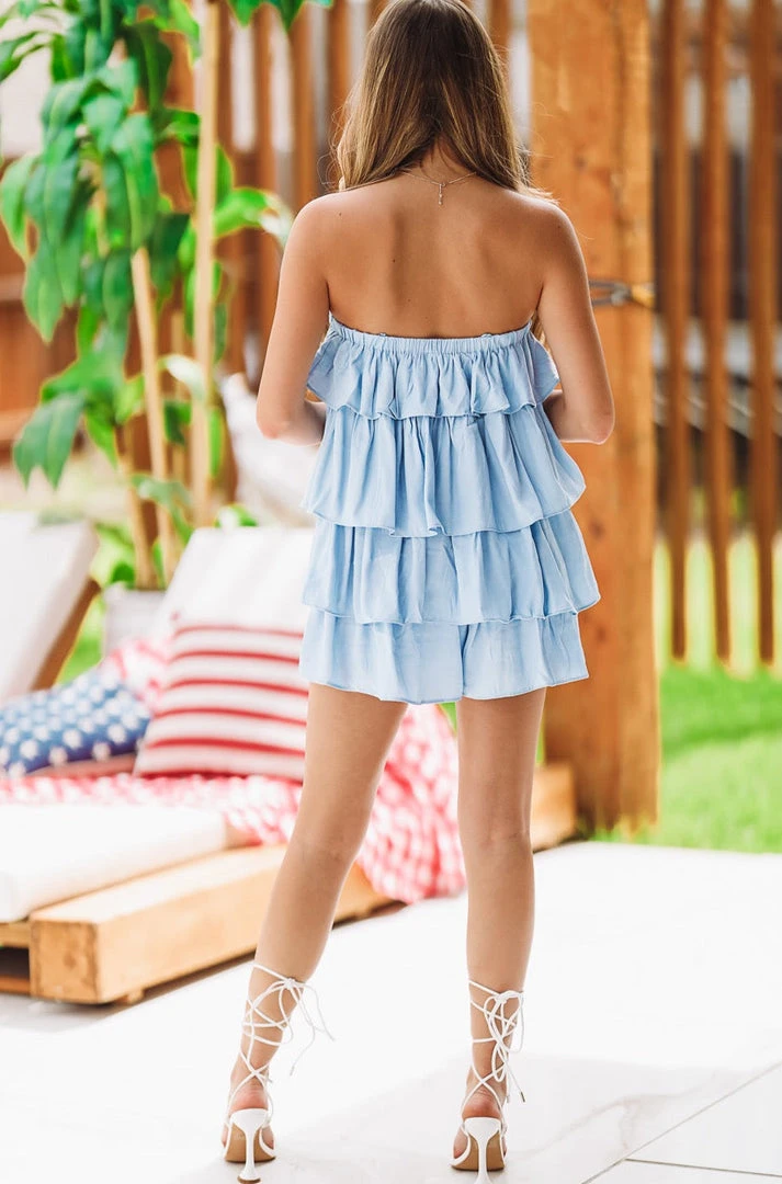 Light blue and YOU! This light blue strapless romper dress has layered ruffles and stretch for the cutest lunch date outfit there ever was. We’ve paired it with our Push Your Luck heels, but this would be just as cute with sneakers.
