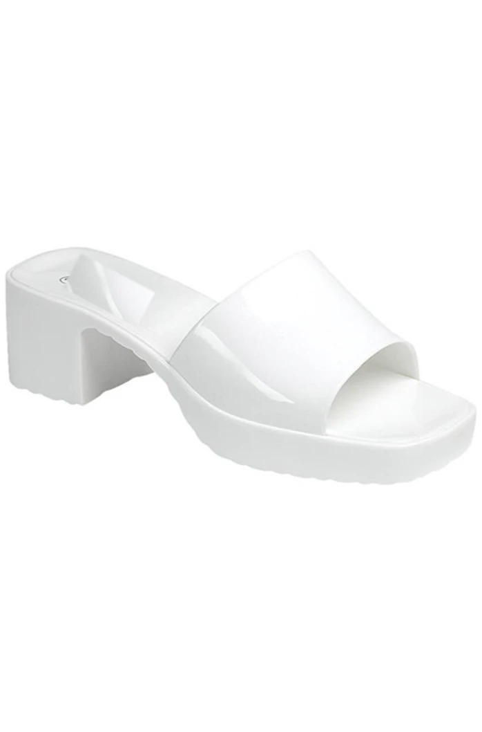 The perfect addition to any trendy boutique outfit! Platform slide on rubber designer inspired sandals with chunky heel. Fit: true to size.