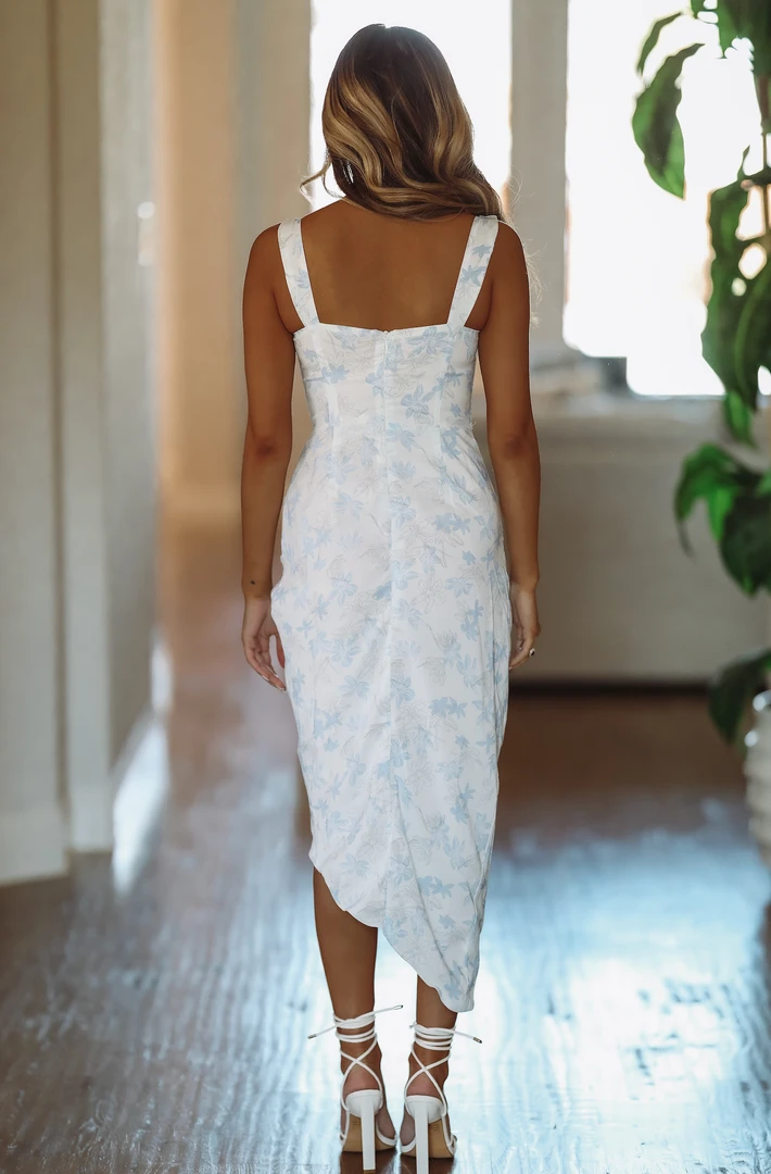 Blooming and beautiful! Our “In Bloom” dress has so many intricate details. It features a sweetheart neckline with spaghetti straps, buttons down the bodice and a gathered hem that meets the slit on this asymmetrical dress. If you’ve got plans for brunch, add this to your cart ASAP! We also love this for showers and destination vacations. This dress is a light blue, but appears white in the photos.