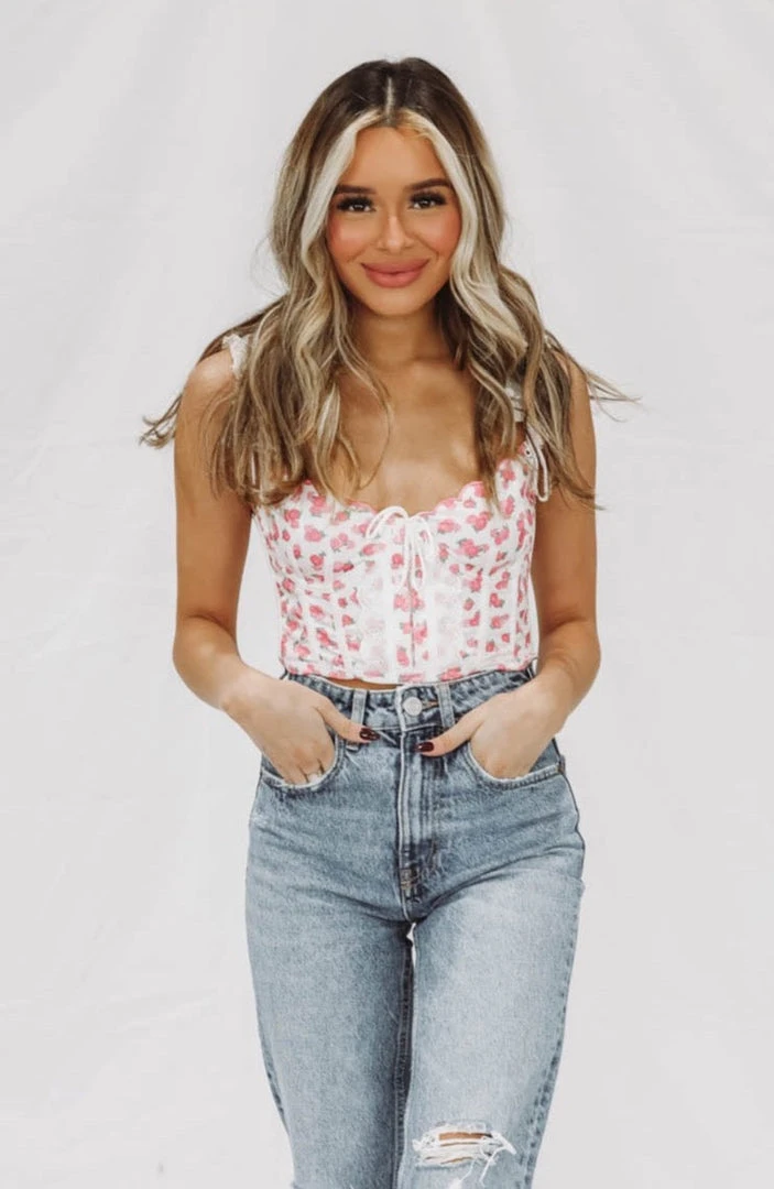 No joke! This is the cutest halter top and is giving us all the “Be My Valentine” vibes. The sweet rose pattern just feels so girly. It has a slight plunging v neck line but is squared off in the back with a cut-out. It is a crop and fits right at the waist line of your jeans or skirt.
