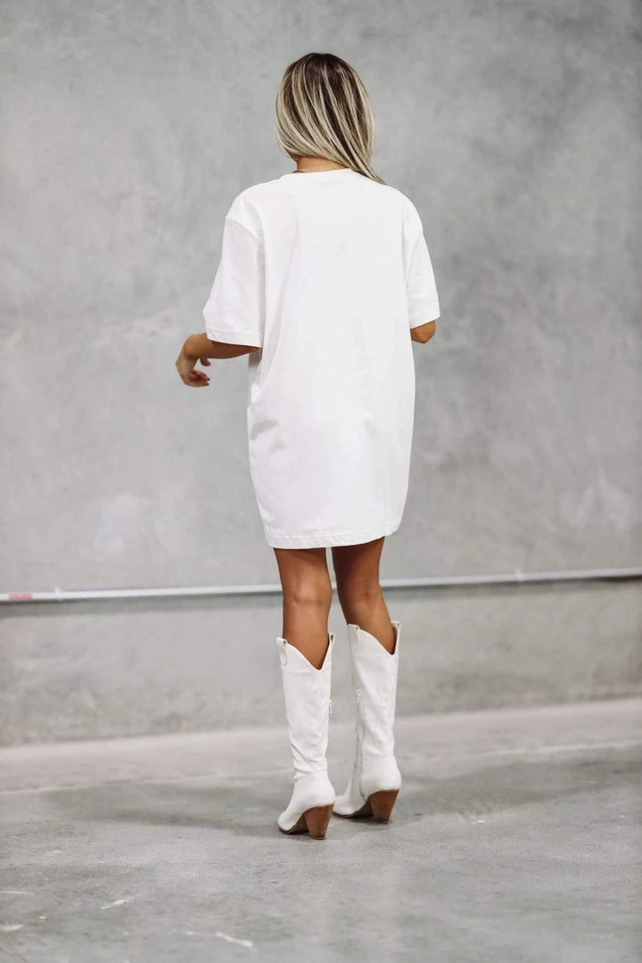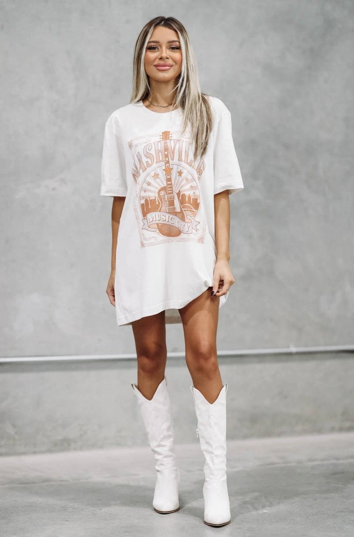 Nashville is always calling our name! This cream t-shirt can also be styled as a dress and is perfect to get us ready for our next trip to the Bluebird Cafe! Put on those cowboy boots and you’re set.