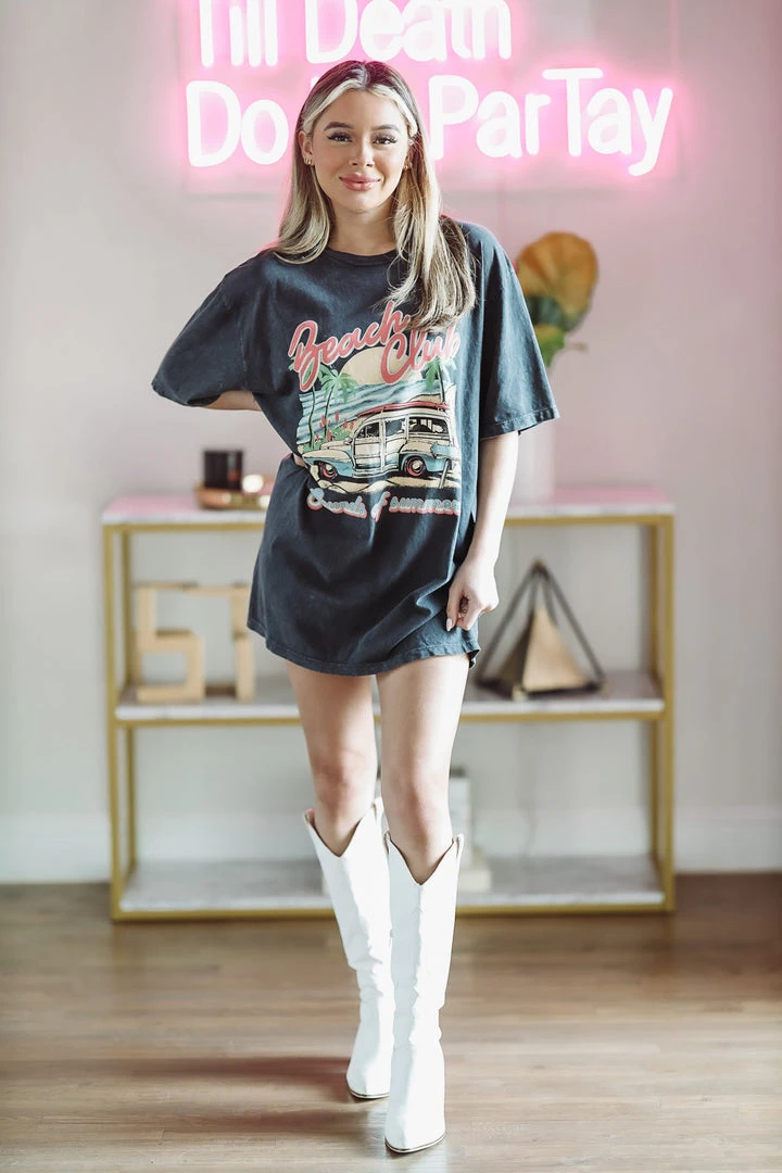 Step away from the cowgirl tees for a minute and grab this Beach Club tee that can also be worn as a dress, but you will need to size up! Summer is upon us and we need all the graphic tees for women. You have places to go and we have the tees for you! With a beach club inspired graphic, you’re ready for summer concerts. This would also be cute to throw on over your swimsuit!