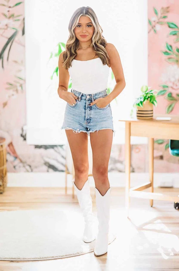 We adore this D’Amour strapless corset for women. This zips up the back and has ruching, which we all love the effect that gives! A bright white is whimsically wonderful for girl’s night out and beyond. We love this with cut off shorts, but it would also be cute with a pencil skirt or jeans.
