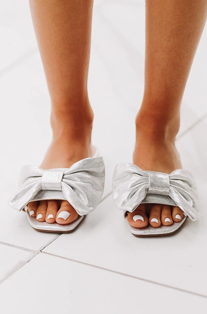 If you want to shimmer from head to toe, we’ve got the toe part covered! The big bows have made their come back from the early 90s and we.are.here.for.it! These flat slides shimmer in sliver and are adorned with that big trending bow!