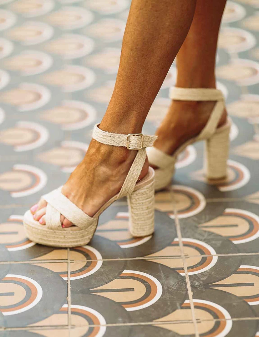 Take these woven platform sandals on vacation! These buckle around the ankle and with a high, mid-size block heel. The color is neutral so they basically go with everything but an evening gown!