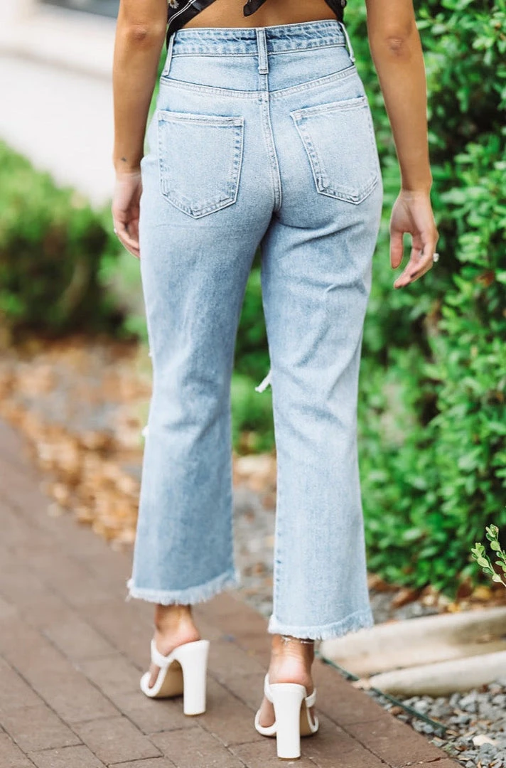 Best boyfriend jeans around! These light-wash, high-waisted cropped jeans with frayed hemlines and ripped knees are the casual to your classy.