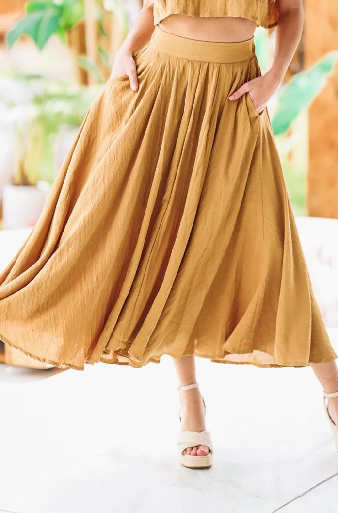 This flowy mustard yellow skirt is perfect for summer and will take you all the way through fall with this versatile color. It’s elastic waist with pockets and hits mid-calf. What more could you want! Pair this mustard yellow skirt with the matching crop top or add a your own spice to this skirt.