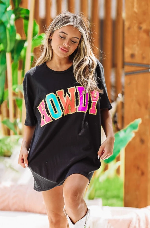 Not your regular Howdy, it’s a shiny HOWDY! This black oversized tee is adorned with H-O-W-D-Y in all the bright colors of summer. Wear this with cut-off shorts or size up and wear as a dress. We have both ways pictured. This is so cute for those summer get-togethers and barbecues.