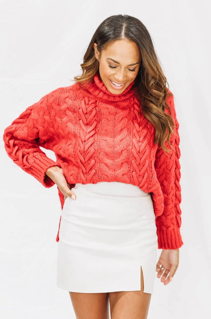 Let’s add a vegan leather skort to your closet ASAP! This cream lined skort is versatile and vivacious. We love the little slit off to the side. It just adds something fun! It measures 15 inches in length from waist to hemline. We’ve paired it with our Knitted Knock Out Sweater, but you could wear anything with this piece.